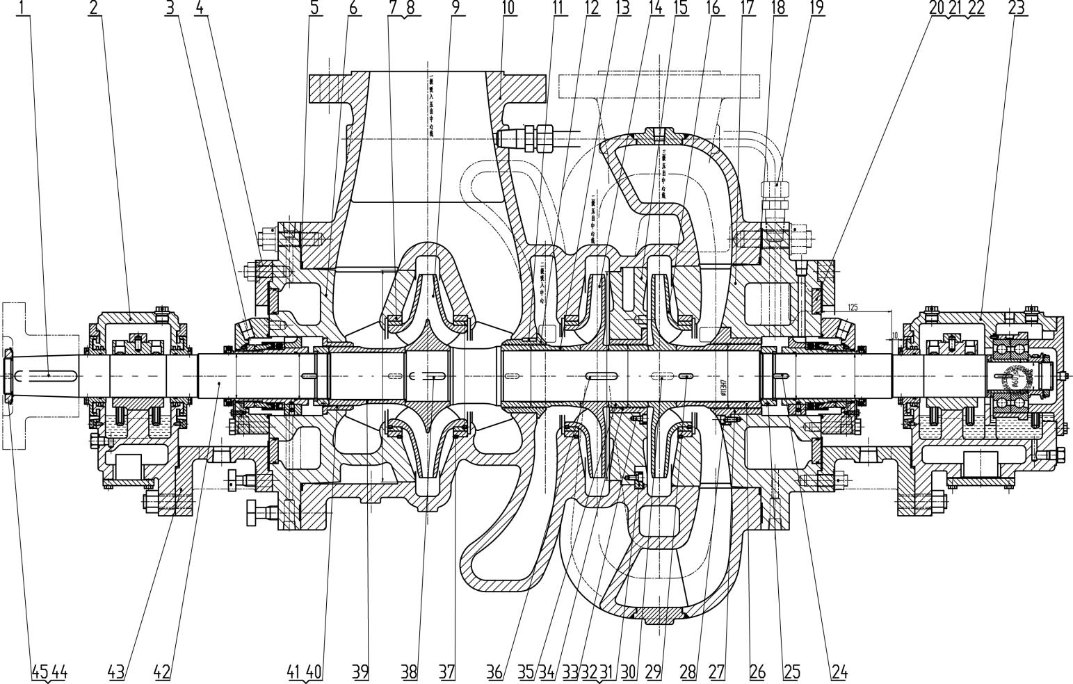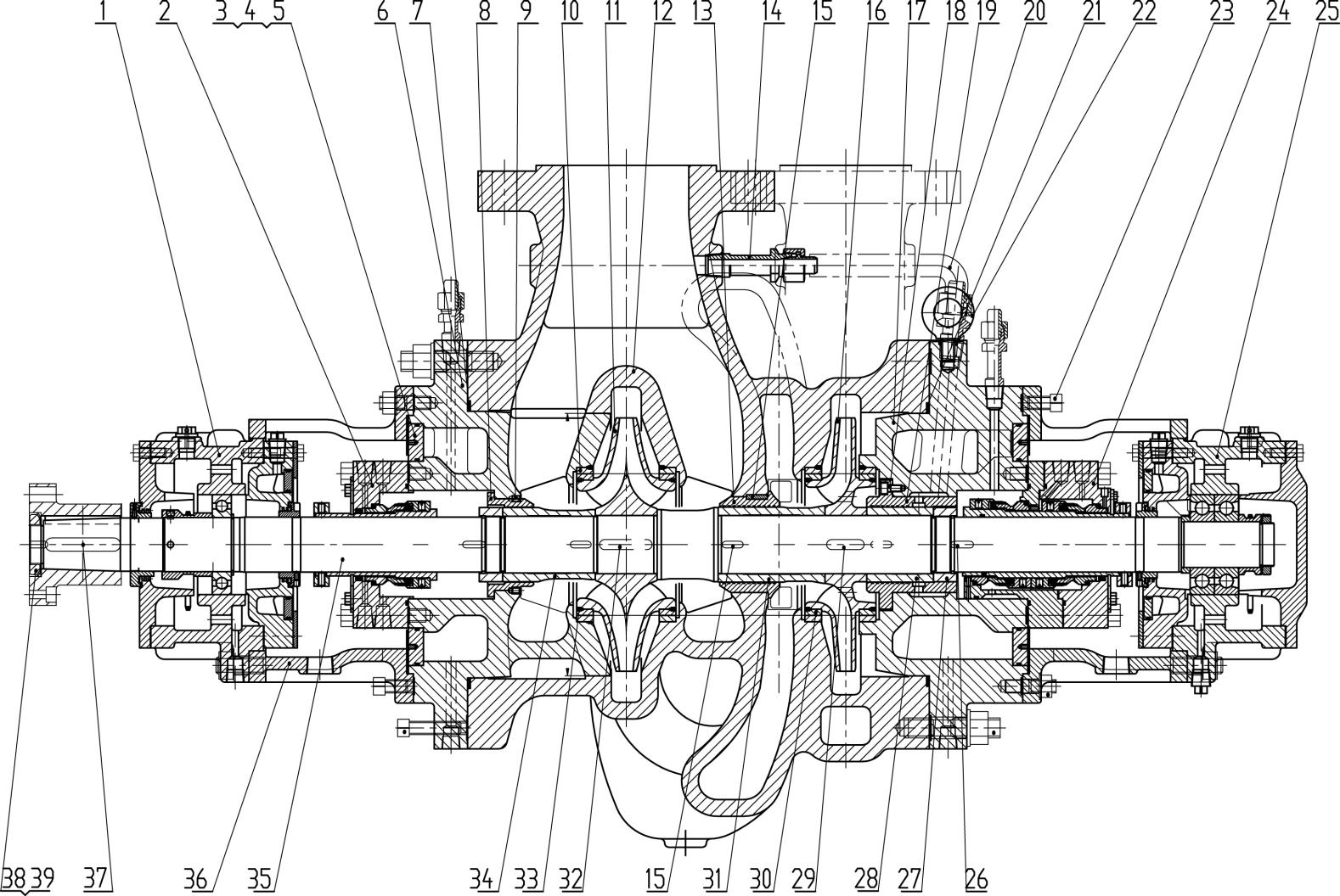 2 | Bearing Component(Drive End) | 14 | Second-stage Impeller | 26 | Shaft Sleeve(Non-Drive End) | 38 | Key(for First-stage Rotor) |